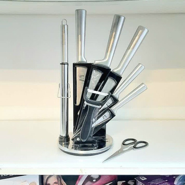 سرویس کارد King Master مدل BDL-26 دارای ۴ عدد چاقو در سایزهای مختلف و یک عدد ساطور دارای سوهان چاقو تیزکن و یک عدد قیچی آشپزخانه به همراه یک عدد پوست کن دارای پایهء مقاوم با ایستایی بالا